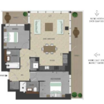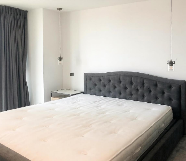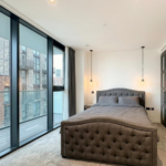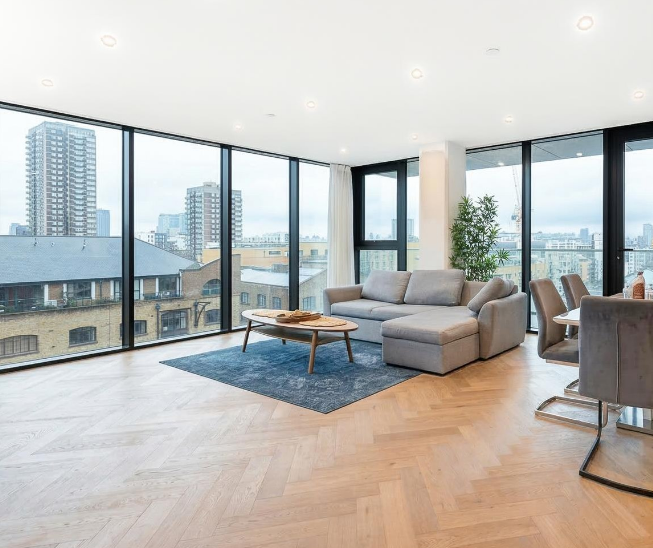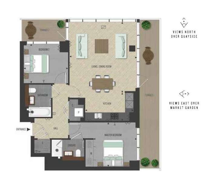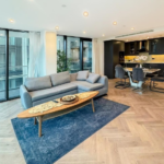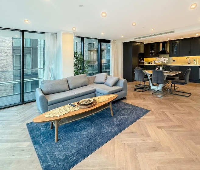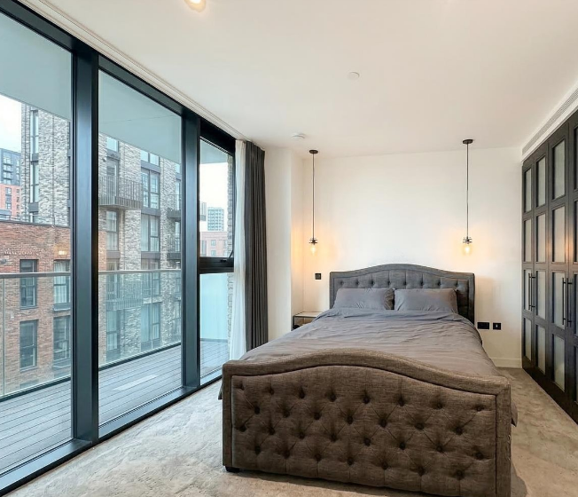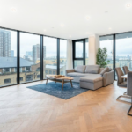 The principal bedroom features bespoke fitted wardrobes and a luxurious en-suite bathroom, while the second well-proportioned double bedroom is served by a high-spec family bathroom. Comfort cooling, underfloor heating, and premium finishes throughout further enhance the apartment’s contemporary living experience.