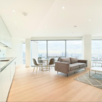 The open-plan living and dining area is bright and spacious, with floor-to-ceiling windows framing the skyline and flooding the apartment with natural light. A sleek, fully fitted kitchen with integrated appliances provides a practical yet elegant space for cooking and entertaining. The bedroom is well-proportioned with built-in storage, while the bathroom is finished to a high standard with modern fixtures.