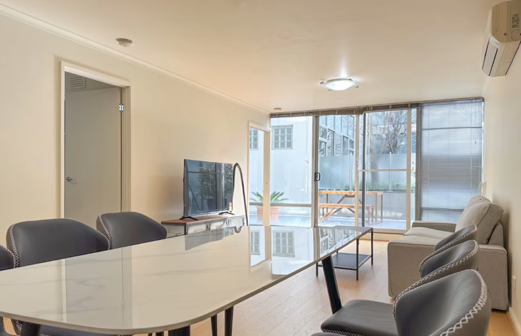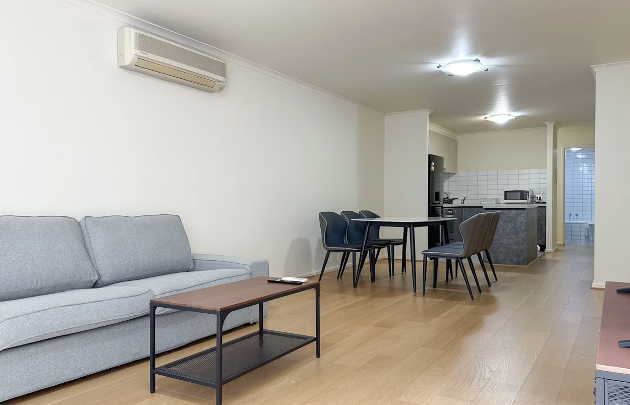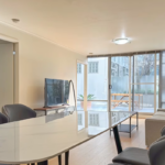 This fully furnished three-bedroom, two-bathroom apartment is ideally situated on the city’s edge, close to North Melbourne and Flagstaff train stations. Just minutes away from Flagstaff Gardens, shopping centers, Docklands, and the iconic Queen Victoria Market, this sophisticated development combines city-edge convenience with a tranquil living environment.