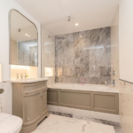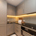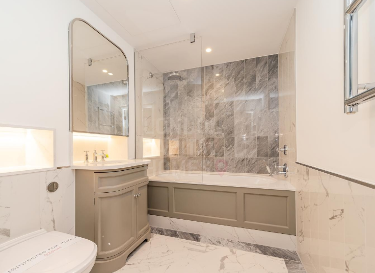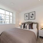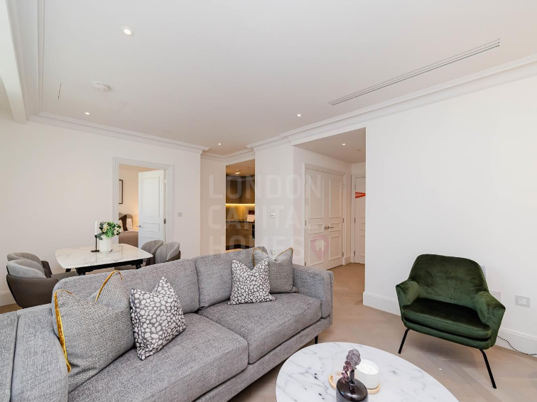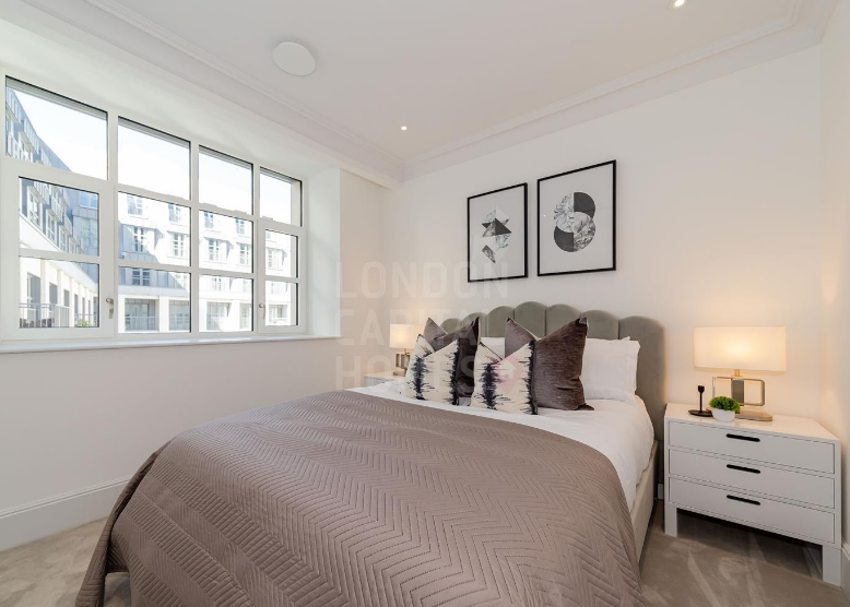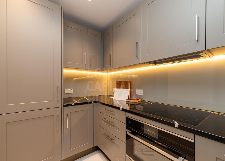 The open-plan kitchen is fitted with premium appliances and refined finishes, flowing into a bright and tranquil living area—perfect for relaxation or entertaining. The generously sized bedroom, decorated in soft neutral tones, is complemented by a luxurious bathroom, creating a serene private retreat in the heart of Westminster.