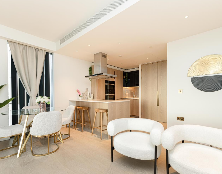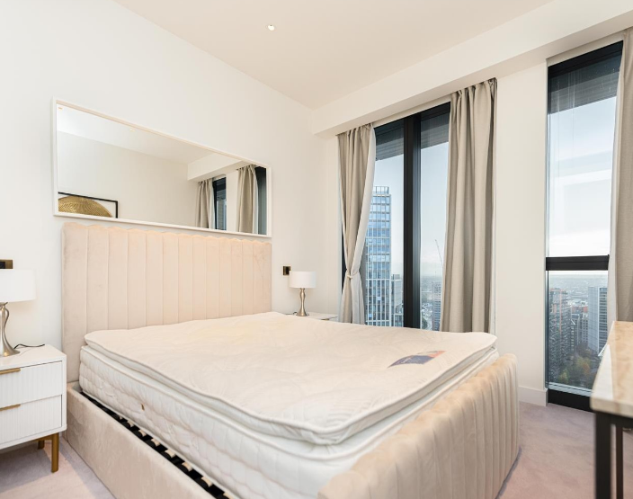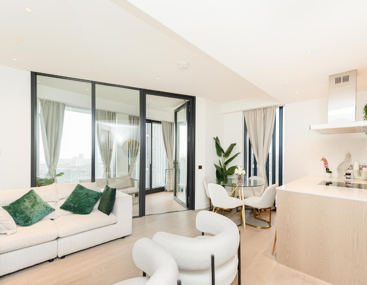 Perched on the 27th floor, this elegant two-bedroom, two-bathroom apartment offers spectacular panoramic views across the River Thames and London’s skyline, delivering a refined riverside lifestyle.